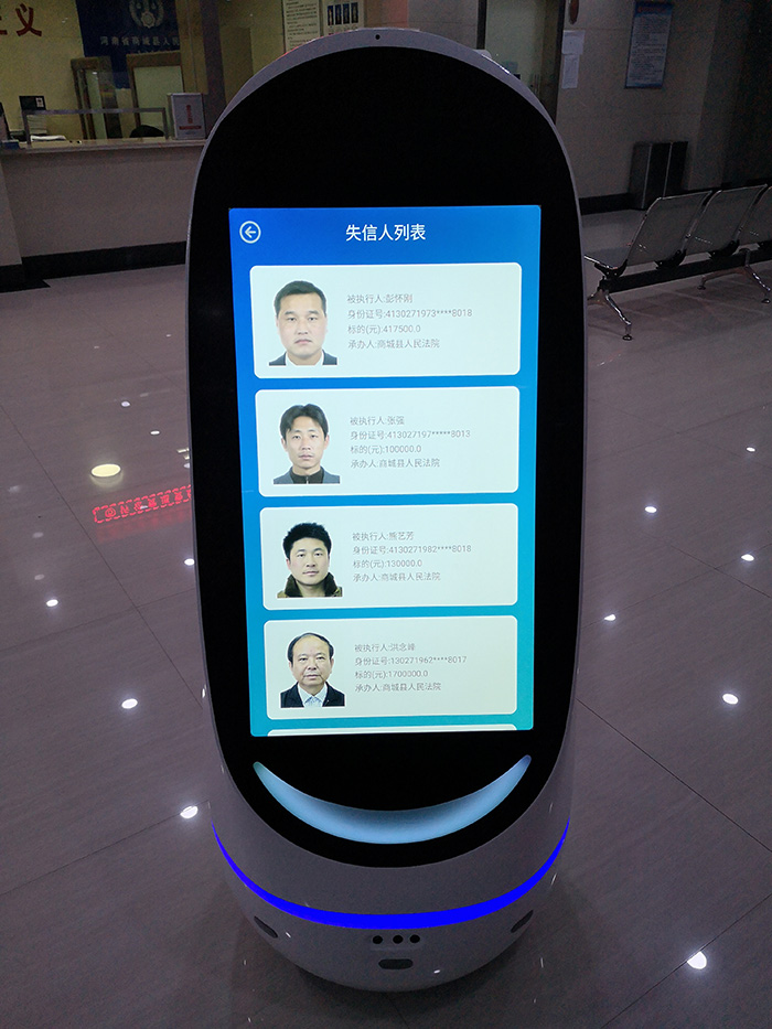 第三天,黃工為培訓客戶如何與導訴機器人進行語音互動,怎麽發出命令讓它去執行。培訓的時候,剛好信陽中院的領導過來視察,黃工演示了一遍機器人如何接待、引領、語音互動、法院信息展示和法官留言等功能,領導表示滿意,覺得中院也可以配置一台。法院的工作人員也過來和導訴機器人互動,對他們來說這還是個新奇產品,體驗後覺得這個機器人很Q,回答十分搞笑但也頗為實用。